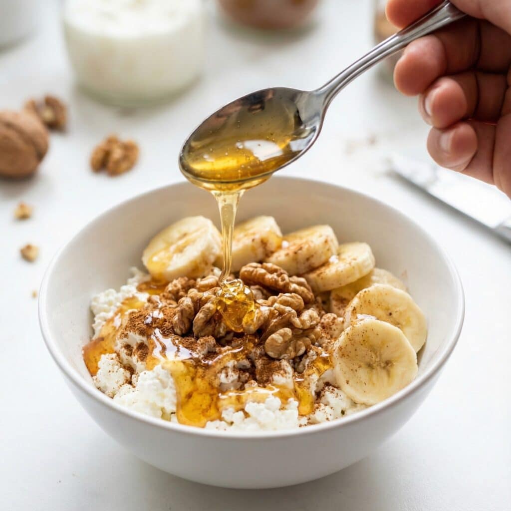 - Add the cottage cheese, honey, cinnamon, chia seeds, and vanilla extract to the bowl with the mashed banana.