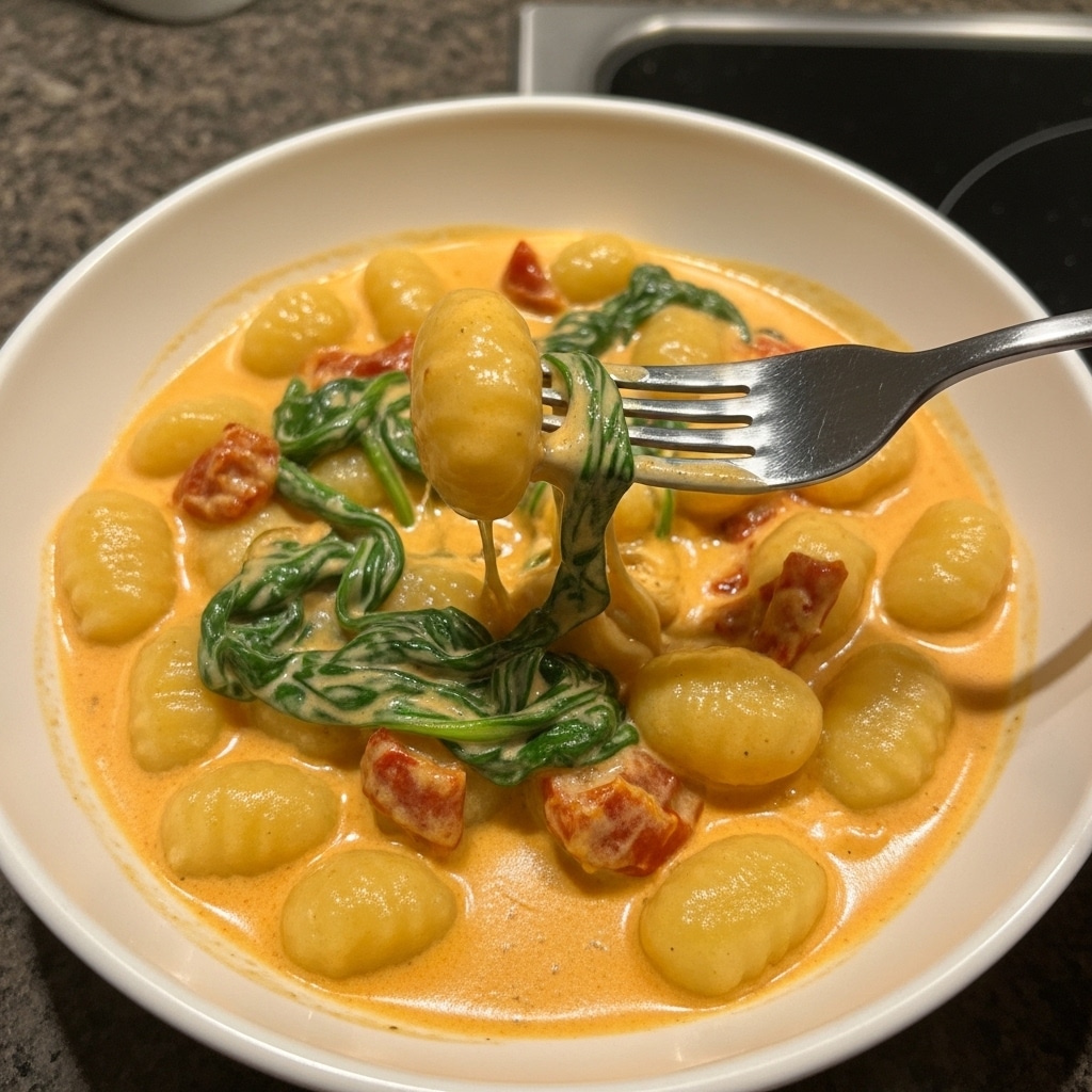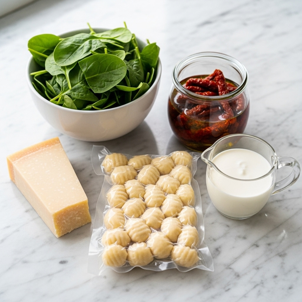- 5 Core Ingredients: Uses just shelf-stable gnocchi, heavy cream, sun-dried tomatoes in oil, baby spinach, and Parmesan cheese.