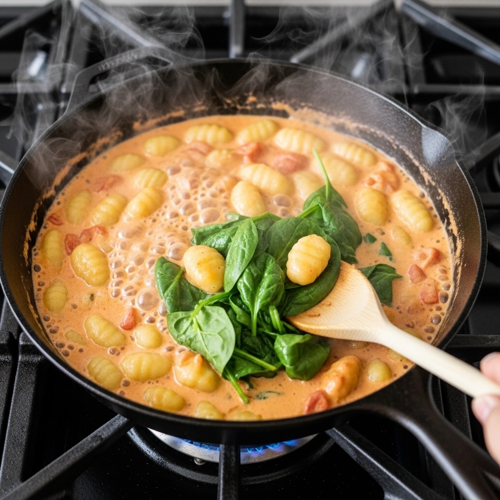 - Cook Gnocchi: Add the uncooked gnocchi directly to the skillet. Stir to coat in the sauce. Simmer for 3-5 minutes, stirring occasionally, until the gnocchi are tender and the sauce has thickened slightly.