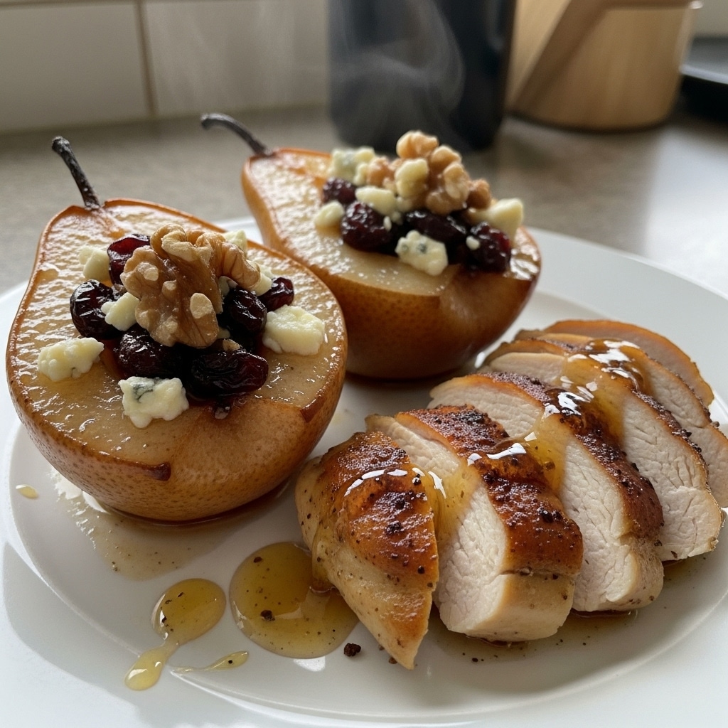 Warm, tender baked pears filled with tart cranberries and toasted walnuts, finished with creamy blue cheese and a glossy honey‑butter cinnamon drizzle—elegant as an appetizer or lighter dessert in 35 minutes.