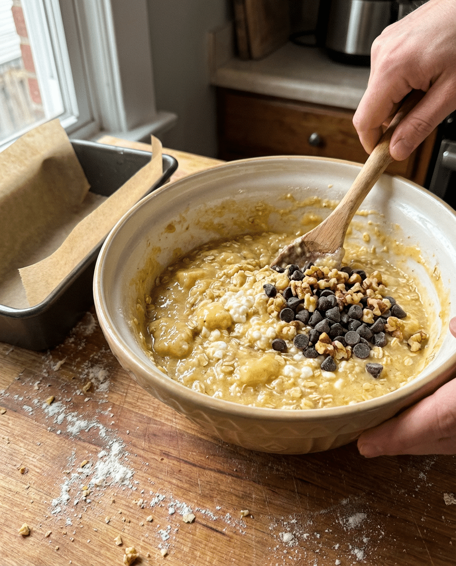 Slowly pour the dry ingredients into the bowl of wet ingredients. Use a folding motion to combine until just smooth avoid overmixing so the loaf stays tender. You should see a thick batter dotted with bits of oats and swirls of banana.