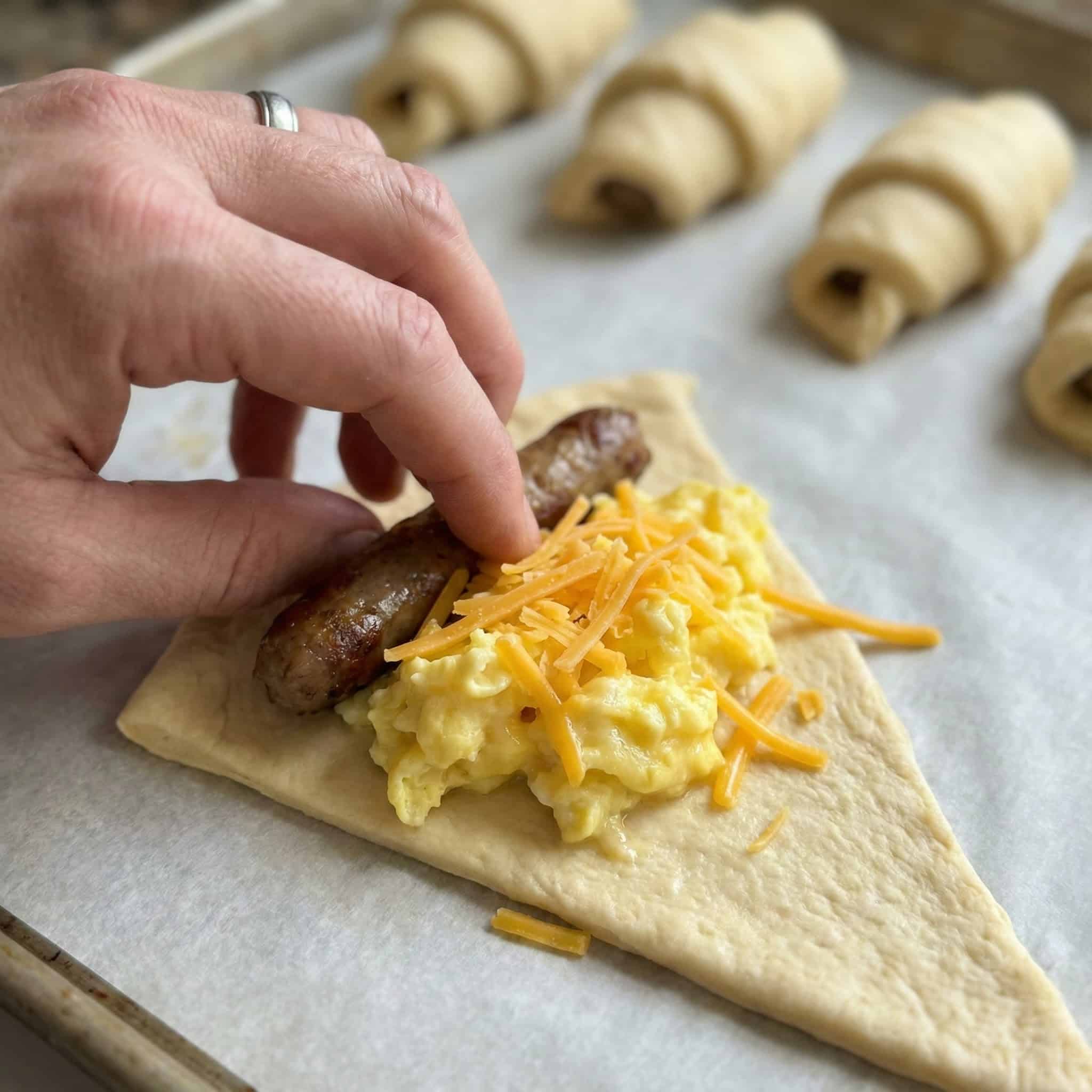 - Place one cooked sausage link on top of the eggs, then loosely roll up the dough starting from the wide end.