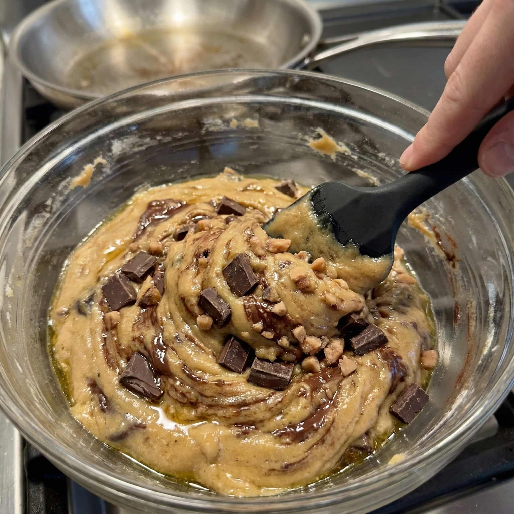 - Stir in the chopped chocolate and toffee bits until evenly distributed throughout the thick, fragrant dough.
