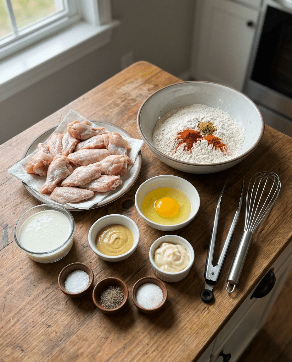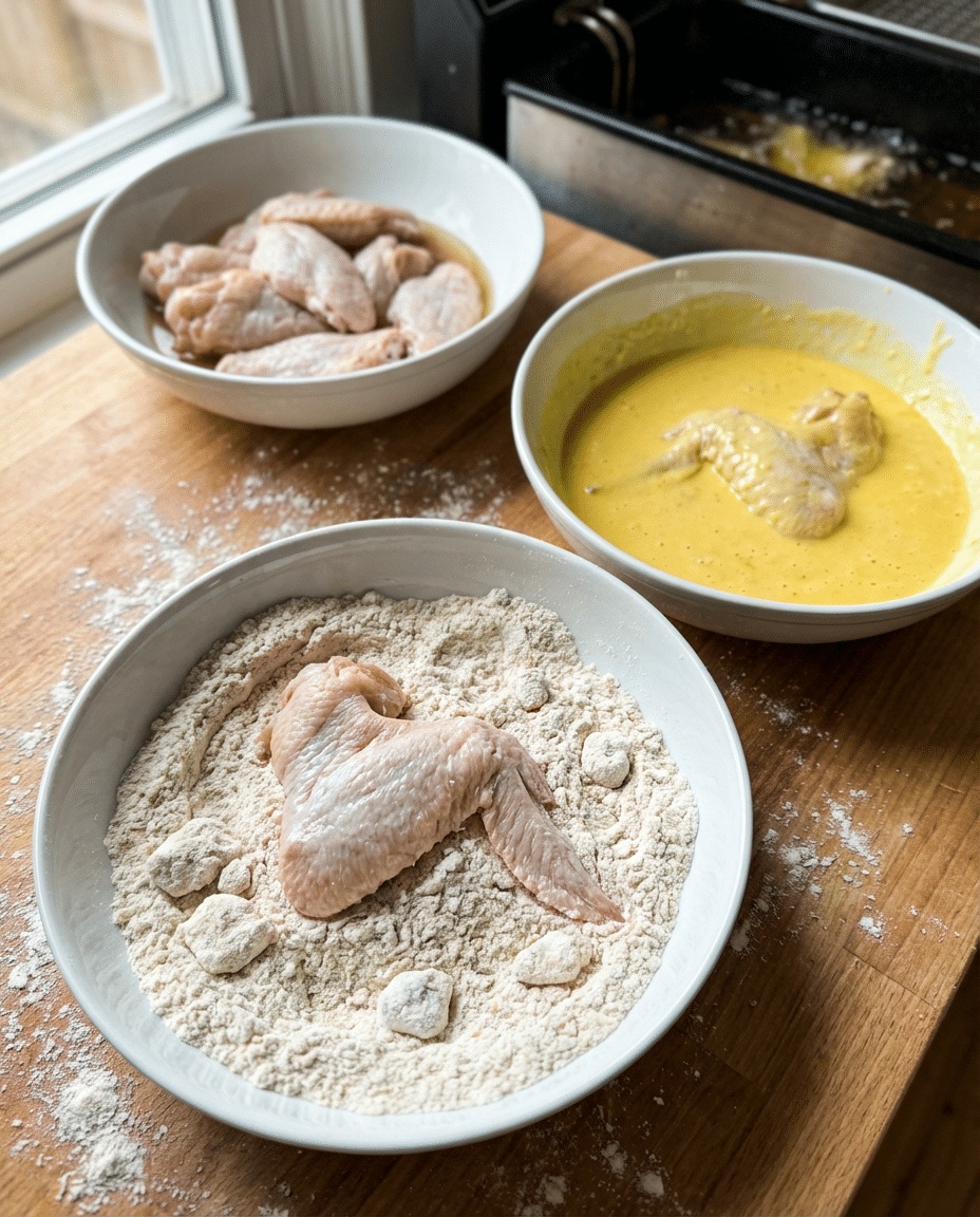 - Freeze set: Chill coated wings 15 min (or 30 min freeze) to lock in breading.