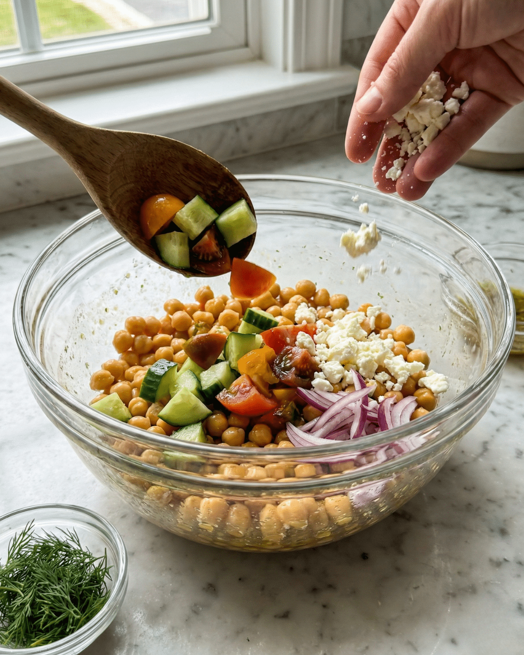 - Prep the Ingredients: Drain and rinse the canned chickpeas, then add them to your large mixing bowl. Chop the cucumber and tomatoes, and coarsely chop the fresh dill or mint.