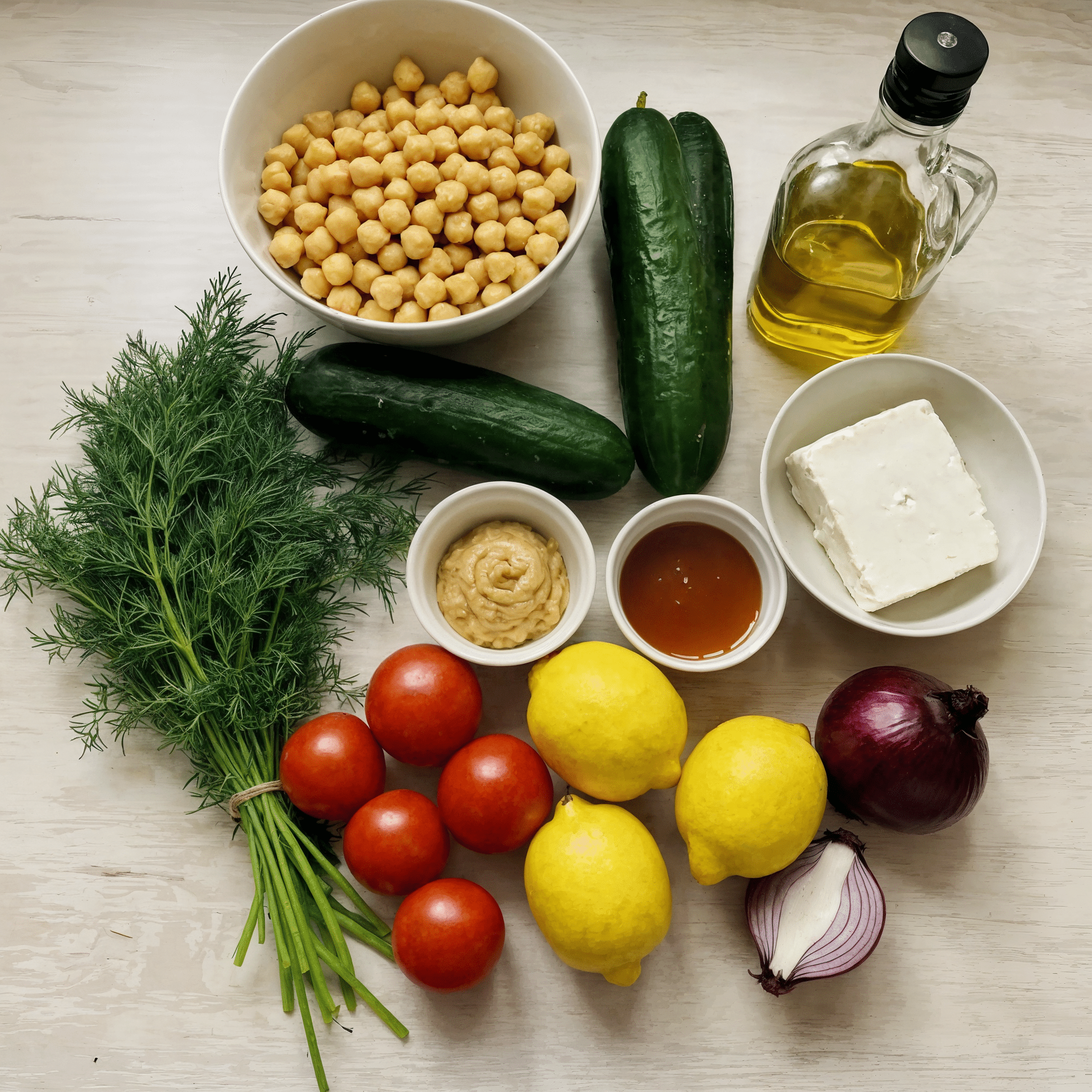 - Make the salad: Open, drain, and rinse the chickpeas, then add them to the bowl with the dressing. Add the chopped cucumber, tomatoes, and dill. Crumble over the feta, then toss well.