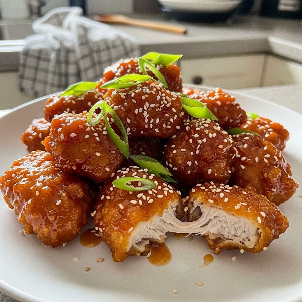 Place hot fried chicken in a large bowl, pour that glorious orange sauce over top, and toss gently. You want every piece coated but not swimming. Garnish with green onions and extra zest. Serve right away while the coating is still shatteringly crisp. This is not a “let it sit” situation.