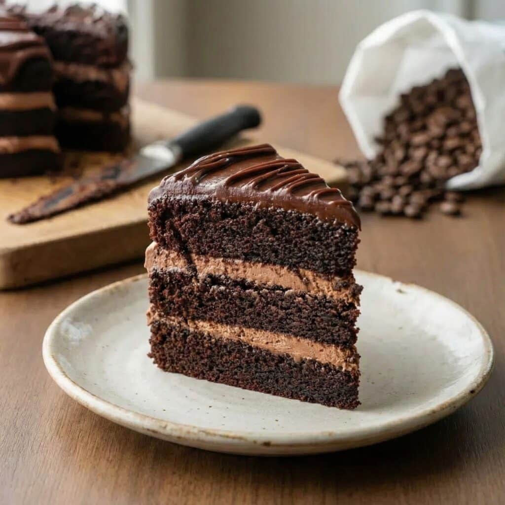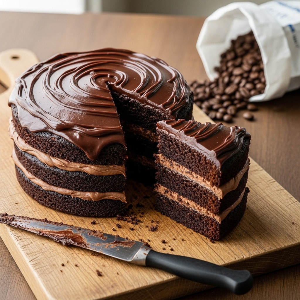 If you love chocolate cake and your morning latte, this recipe is going to be your new obsession. This isn’t just a regular chocolate cake with a hint of coffee; it’s a rich, fudgy masterpiece that uses a special “coffee soak” technique (just like professional bakeries do!) to keep every crumb incredibly moist. I’ve made this for birthdays, dinner parties, and “just because” weekends, and it honestly rivals anything you’d buy at a fancy shop. Best of all? You don’t even need a mixer for the frosting.