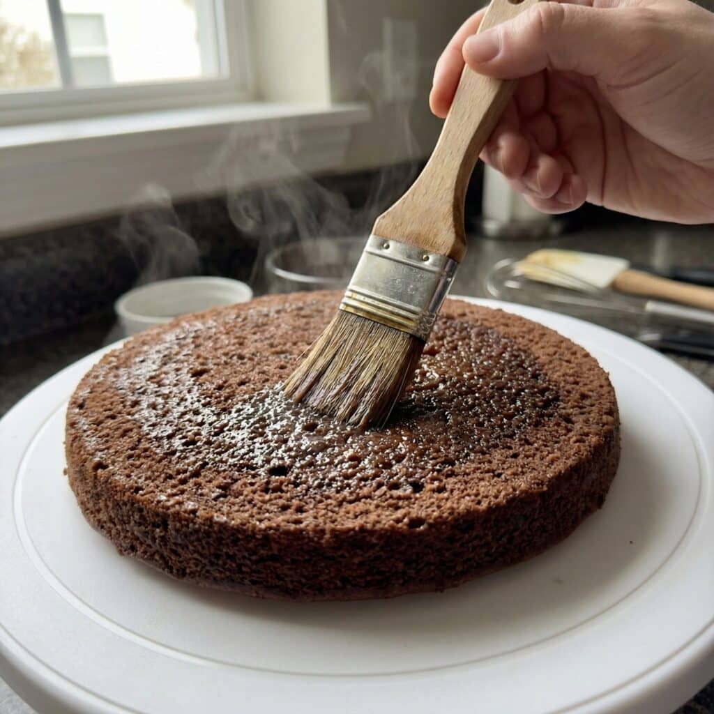 - Make the Soak: While cakes cool, whisk together the soak ingredients (boiling water, espresso powder, cocoa, sugar) in a small bowl until dissolved. Let cool slightly.