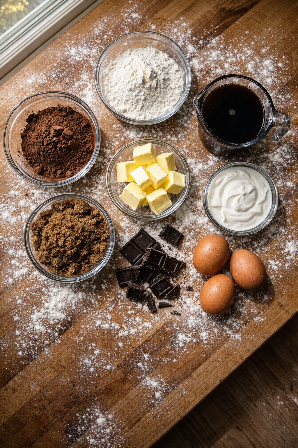 - Mix Dry Ingredients: In a large bowl, whisk together the flour, cocoa powder, granulated sugar, dark brown sugar, baking soda, baking powder, and salt.