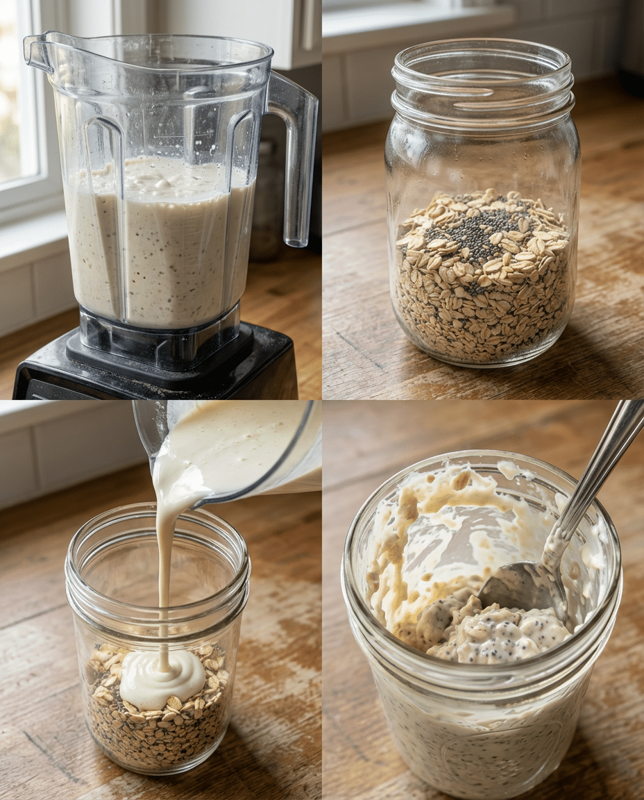 - Combine: In a mason jar or container, add the rolled oats and chia seeds. Pour the blended cottage cheese mixture over the dry ingredients.