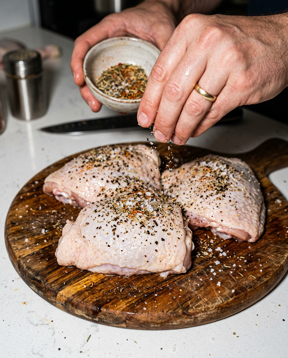 - Preheat your oven to 375°F and season chicken thighs with salt, pepper, and poultry seasoning.