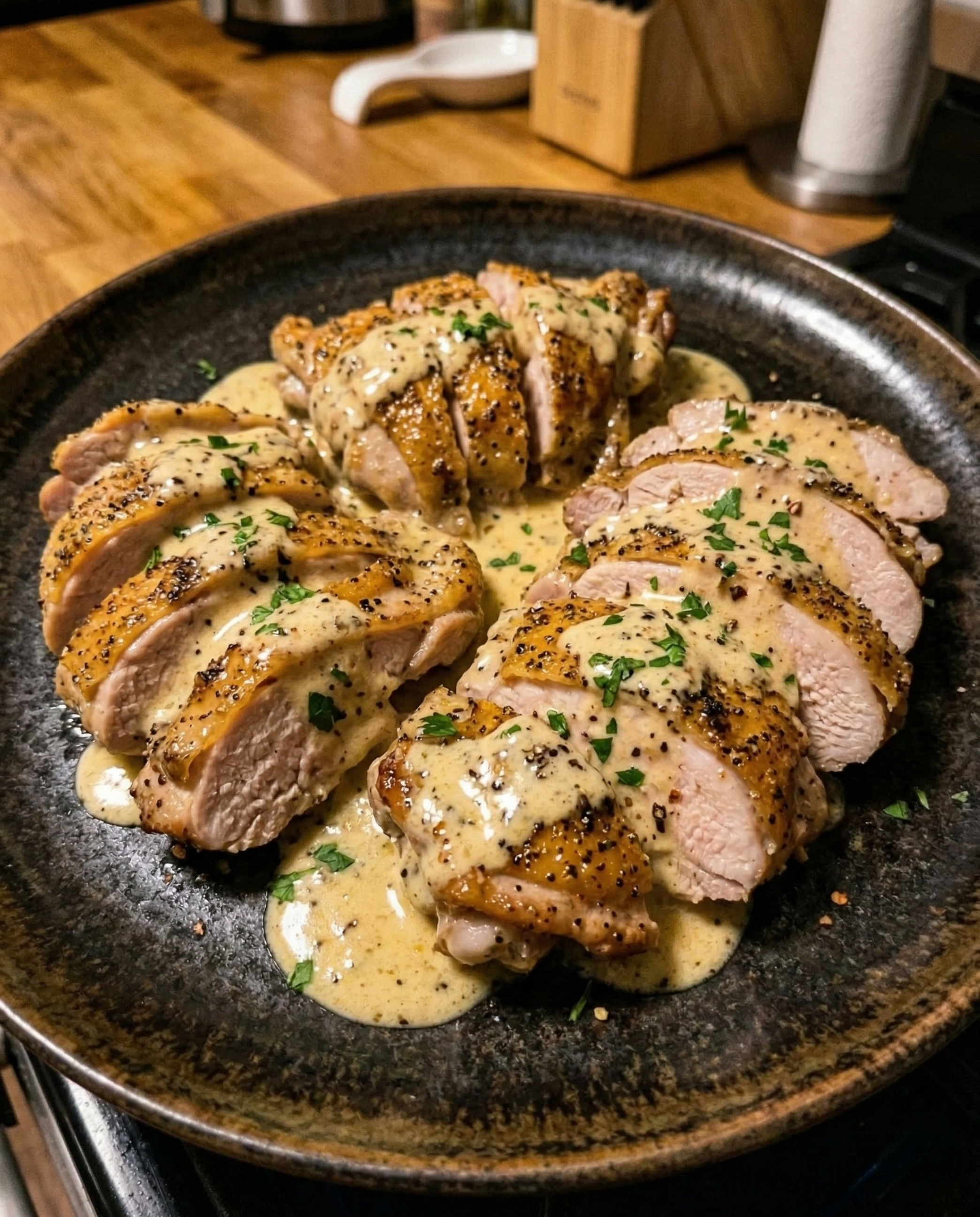 - Melt butter in an oven-safe skillet over medium heat. Sear chicken 2–3 minutes per side until golden. Set aside.