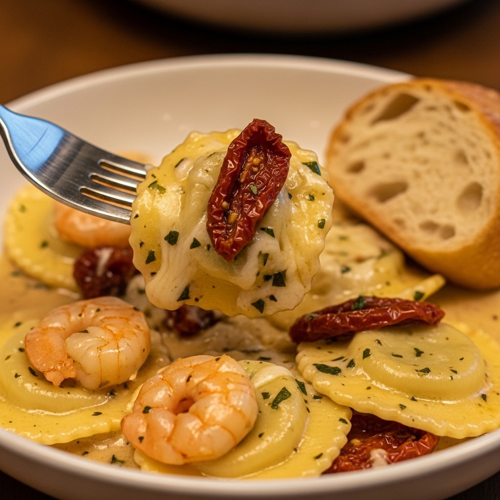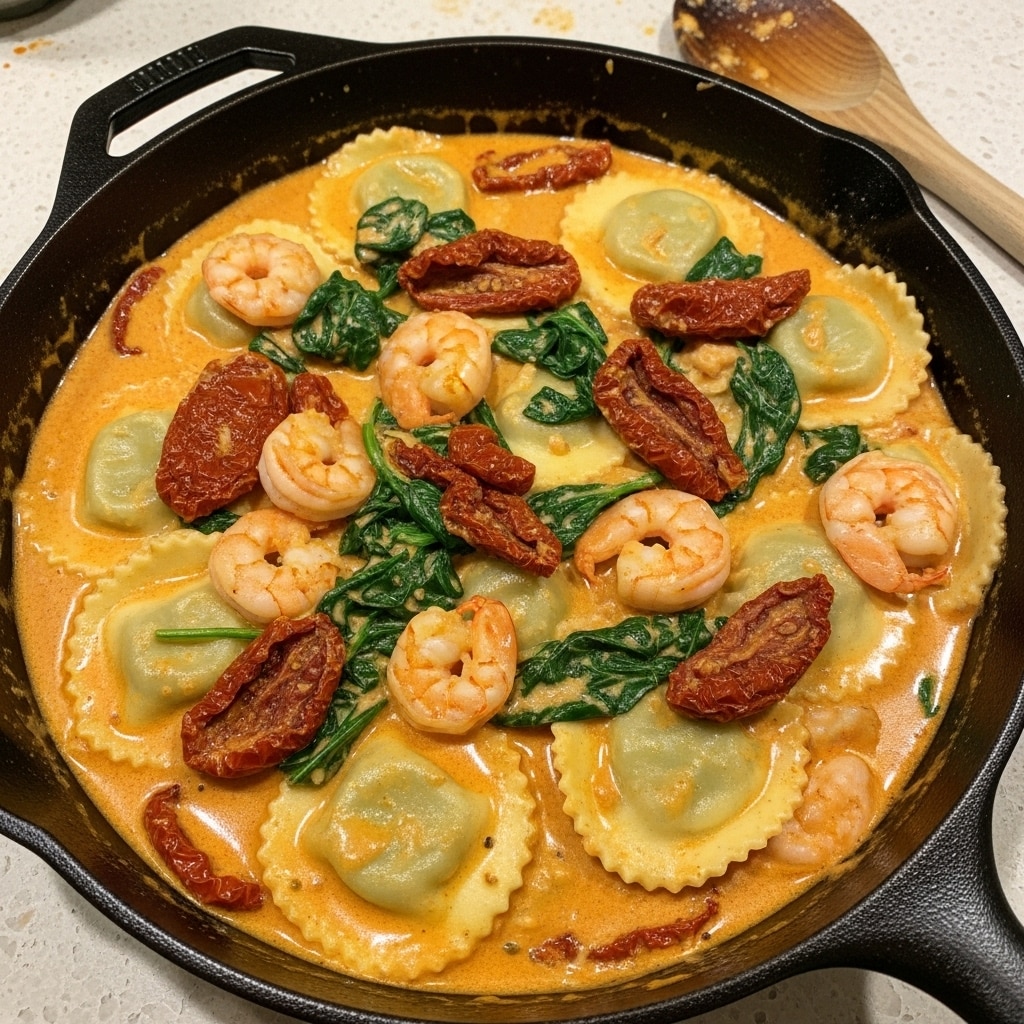 If you’ve ever had a long week where you crave something that tastes fancy but requires practically zero effort, this recipe is your answer. I call it my “back-pocket date night” meal because it looks incredibly impressive—plump pink shrimp, vibrant green spinach, and those little gems of sun-dried tomatoes—but honestly? It comes together faster than waiting for takeout delivery. The sauce is velvety and clings to the cheese ravioli in the most satisfying way. You barely even need a side dish, though a piece of crusty bread is non-negotiable for mopping up that golden, garlicky cream.
