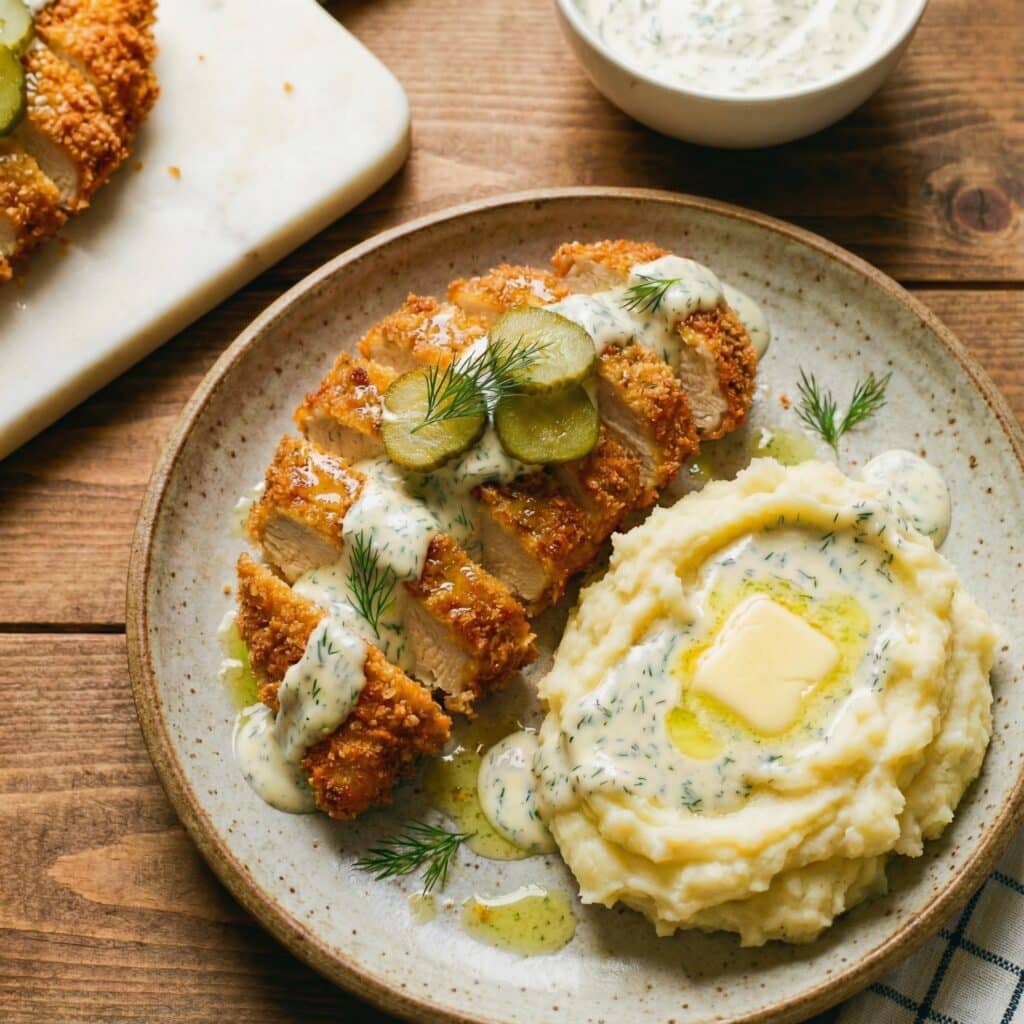 - Rest and Serve: Let the chicken rest for 5 minutes before serving to keep the juices in. Top with fresh dill and chopped pickles.
