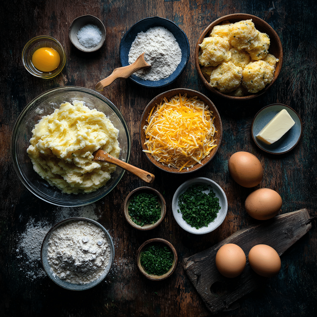 - Mix Ingredients: In a large mixing bowl, combine the cold mashed potatoes, shredded cheddar cheese, eggs, flour, salt, pepper, and garlic powder. Mix until a thick, slightly sticky dough forms.