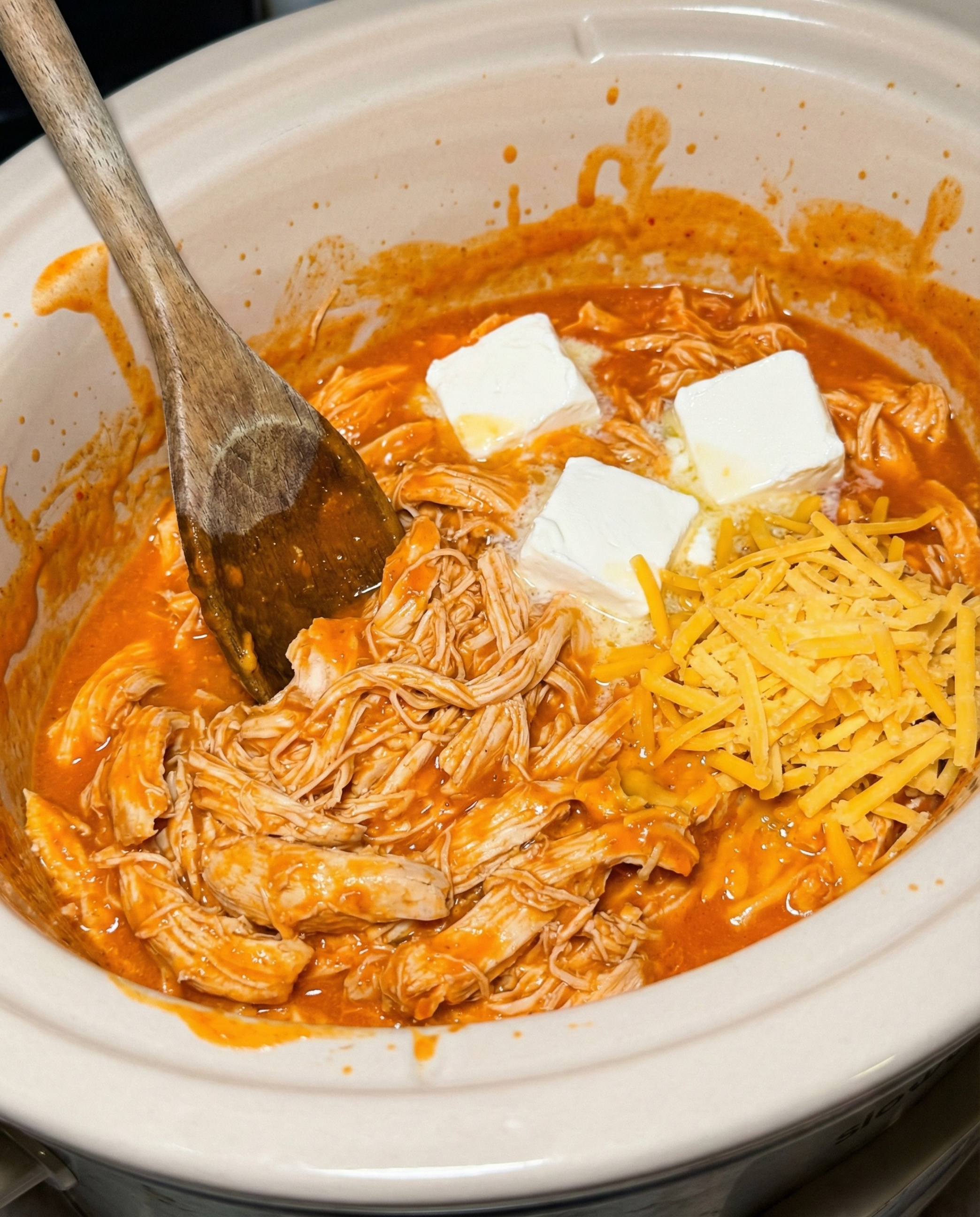 - Melt the Cheeses: Add the cubed cream cheese, shredded cheddar, and shredded Monterey Jack to the hot chicken mixture. Stir, cover, and cook for another 30 minutes to let everything melt together into a sauce.