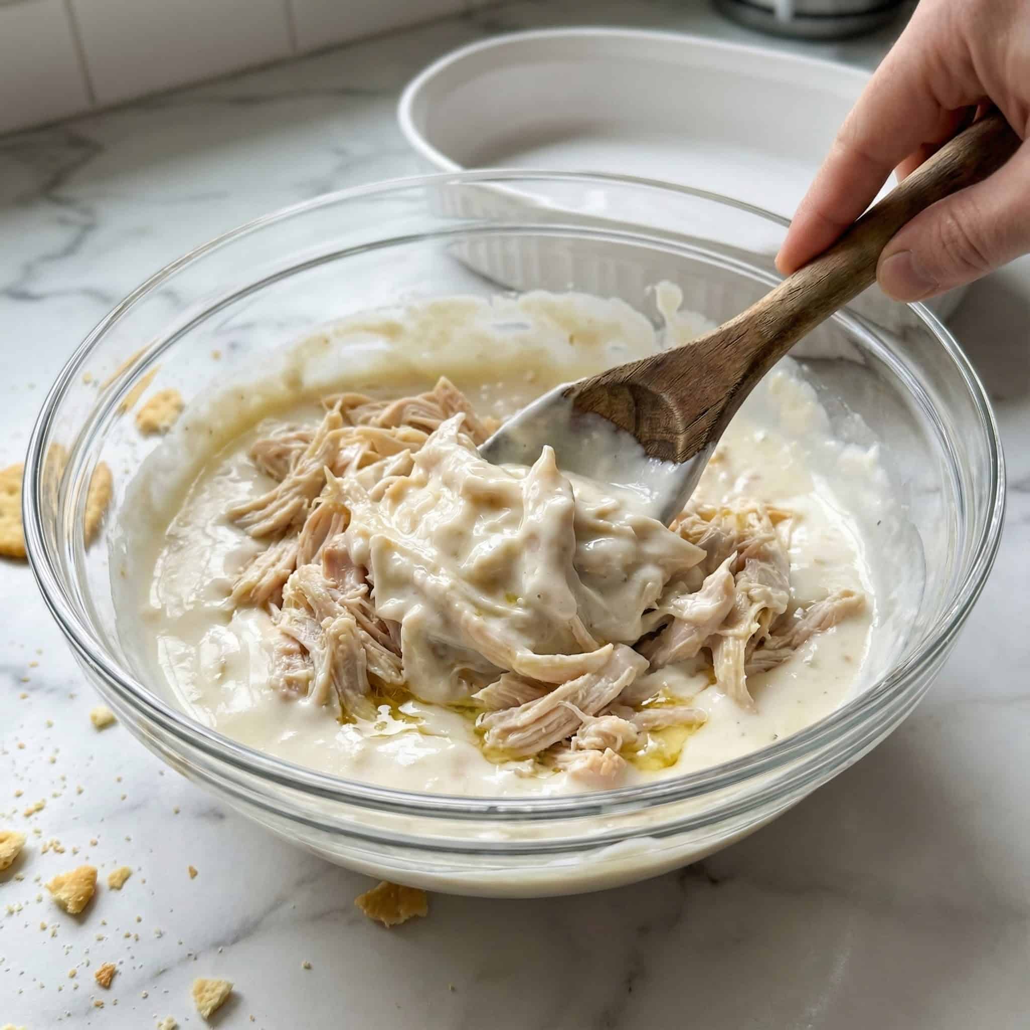 - In a large mixing bowl, stir together the shredded chicken, cream of chicken soup, and sour cream until well combined and creamy.