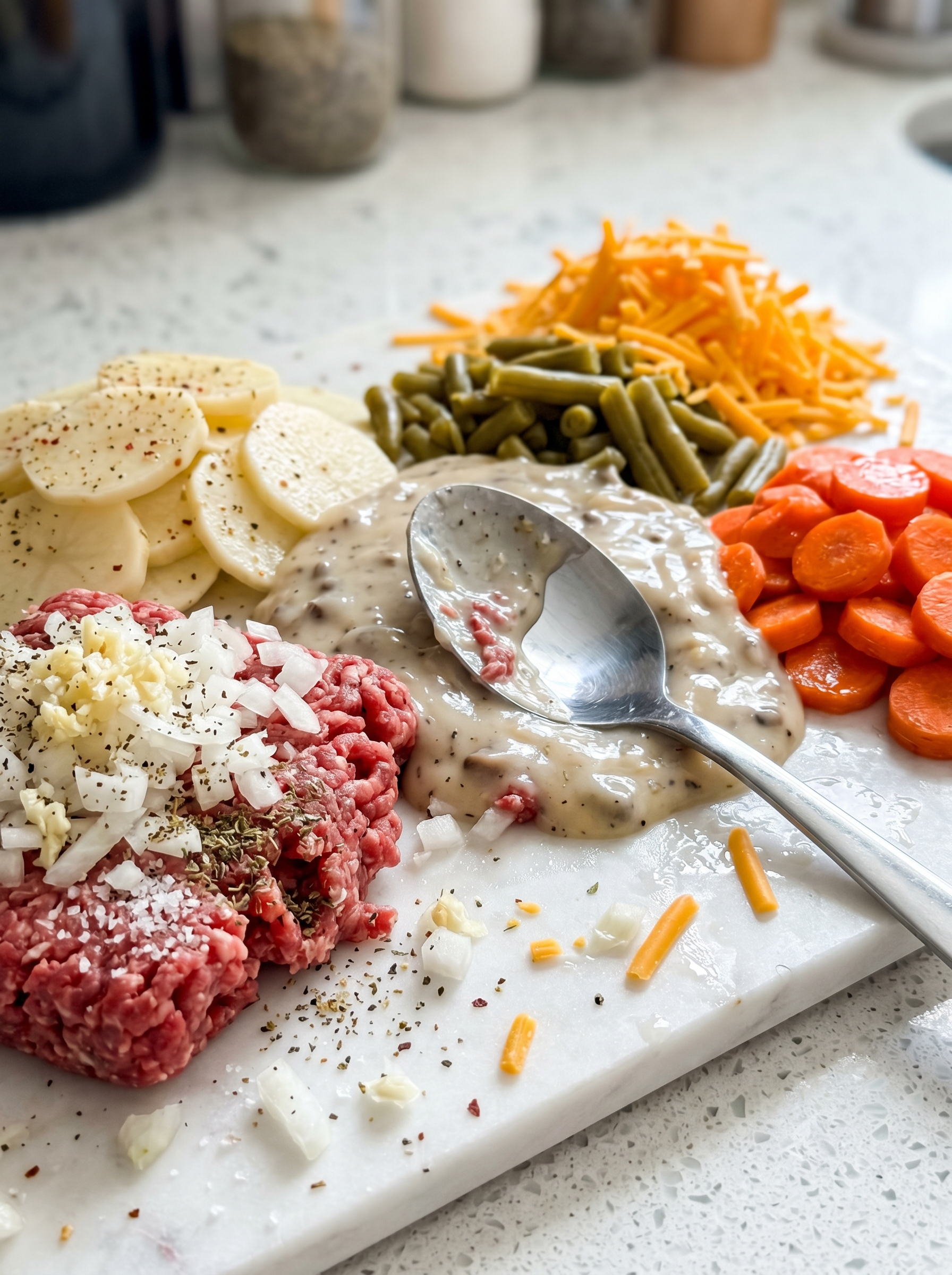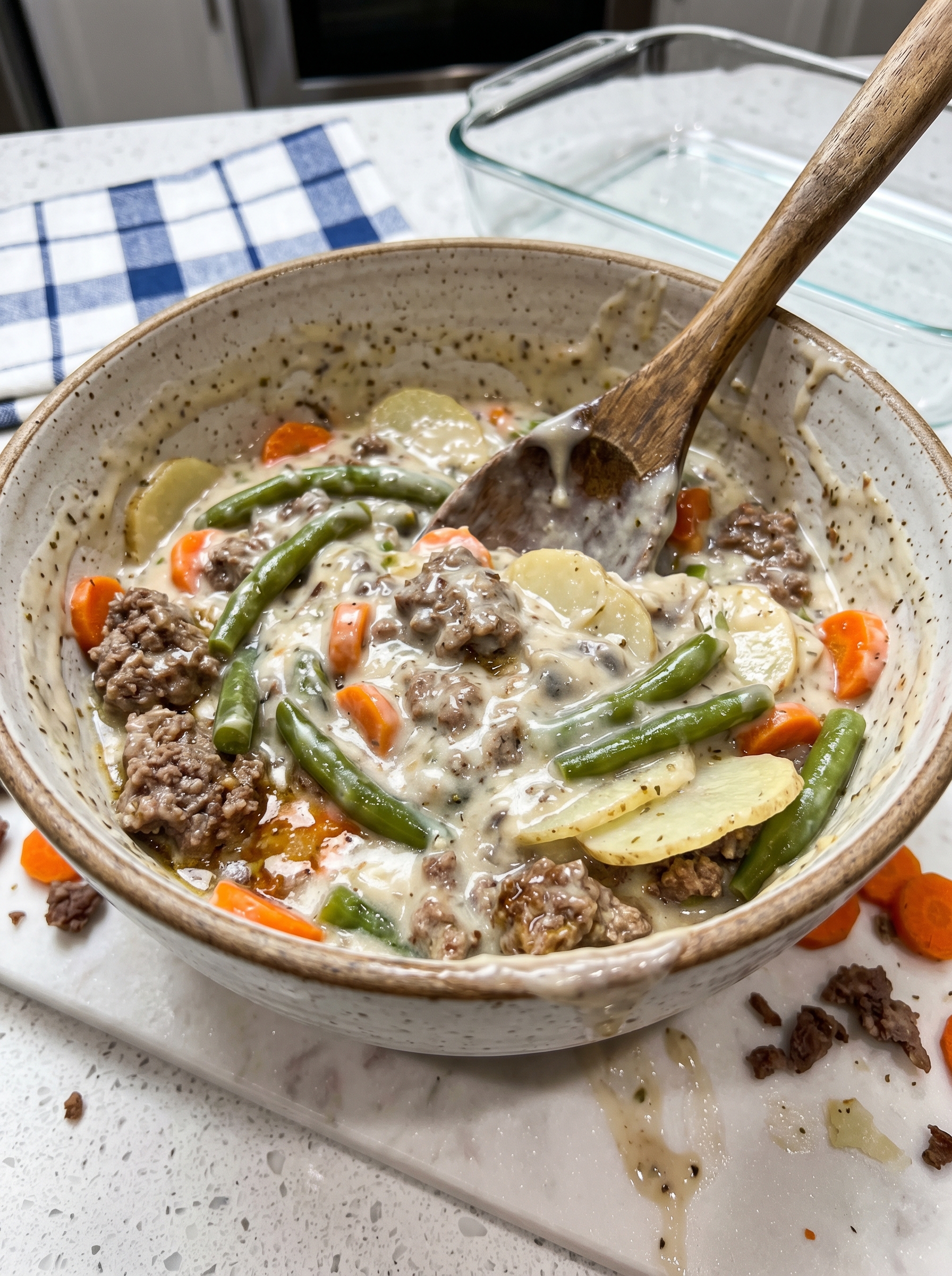 - Combine the magic! In your biggest mixing bowl, gently toss the browned meat mixture, sliced potatoes, carrots, drained green beans, creamy soup, and milk.