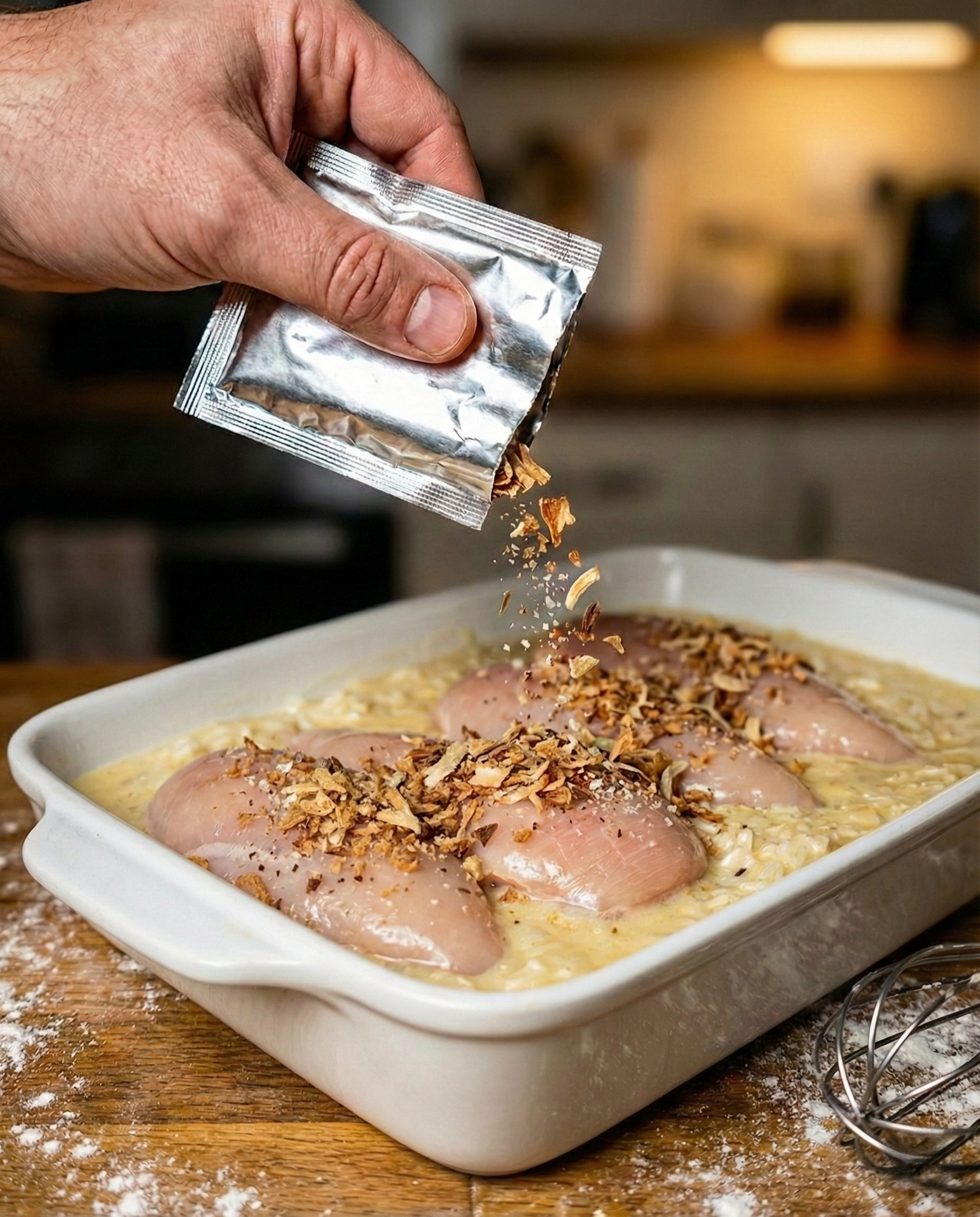 - Sprinkle the packet of dry onion soup mix generously over the chicken breasts. Drizzle with a little melted butter if you’re feeling fancy.