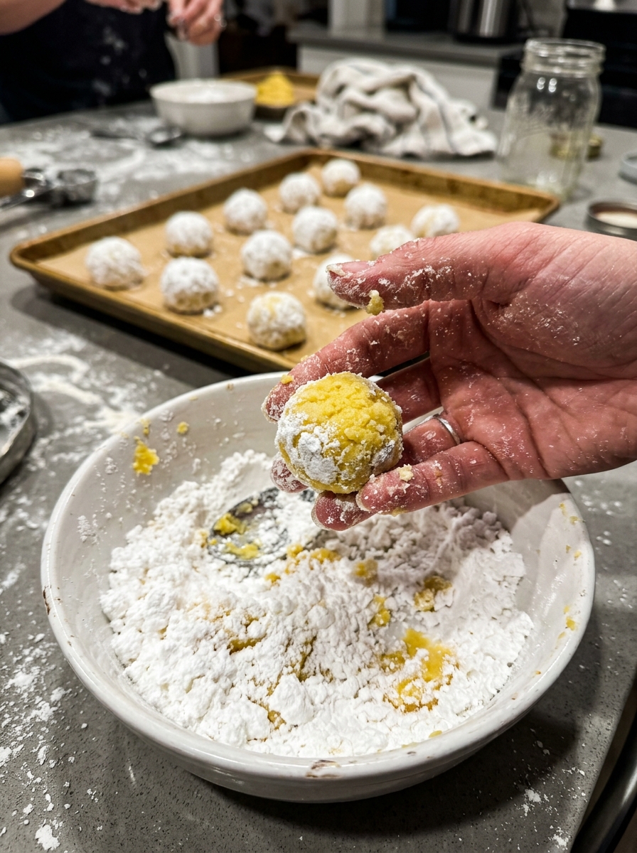 - Scoop tablespoon-sized balls of dough, smooth them between your palms, and roll them generously in powdered sugar until completely coated.