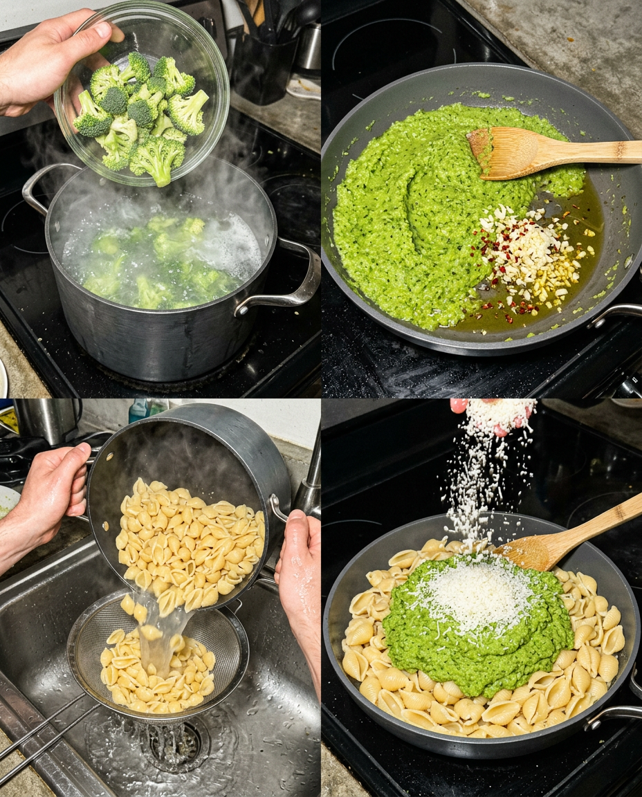 - Combine and Serve: Add the drained pasta and Parmesan cheese directly to the skillet with the broccoli mash. Stir everything together until the pasta is well-coated. Adjust the sauce consistency with a splash of reserved pasta water if needed. Serve immediately.