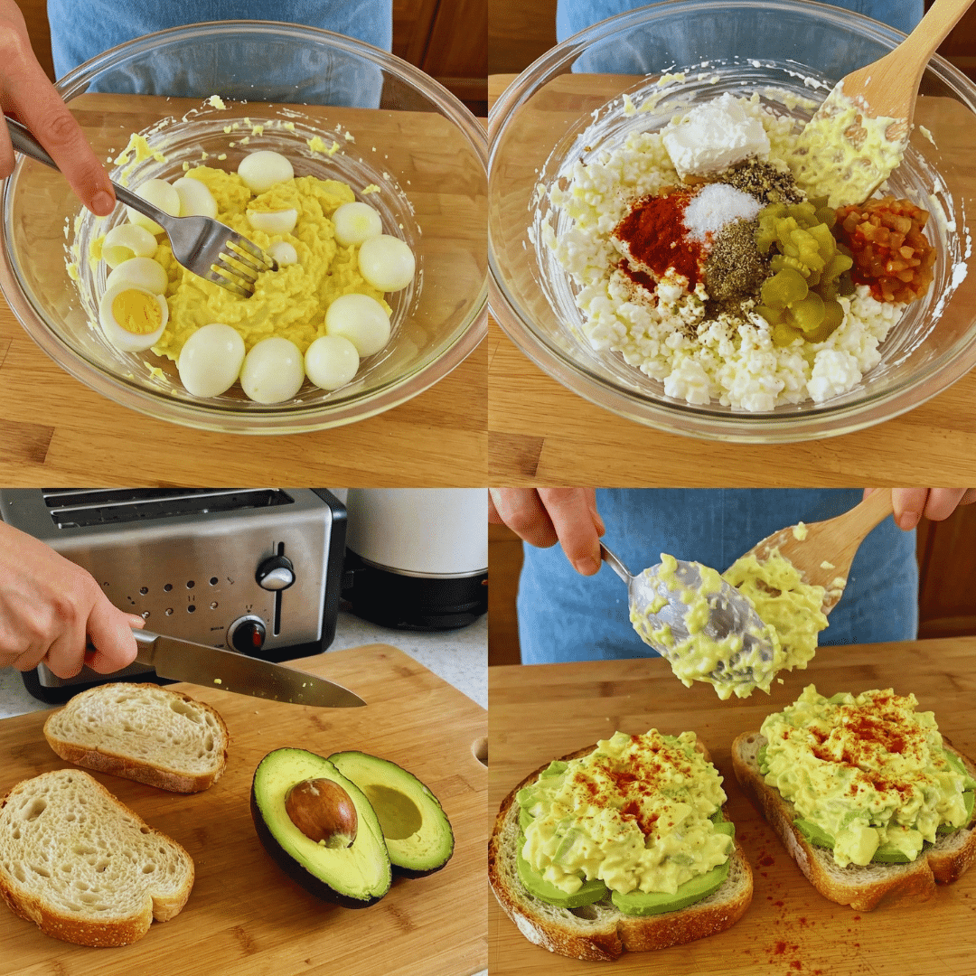 - Prepare the egg salad: In a medium bowl, mash peeled eggs with a fork. Add cottage cheese, salt, black pepper, and smoked paprika. Stir in relish or diced pickles.