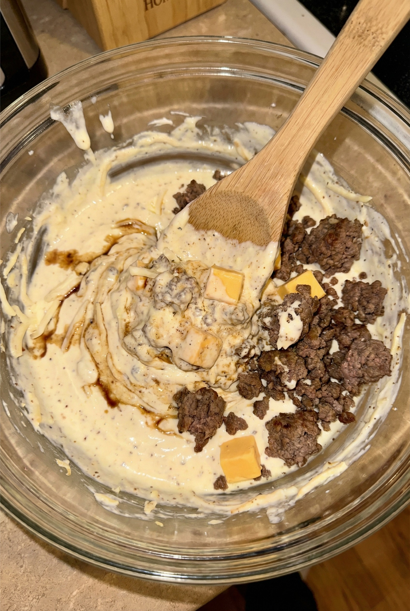 - Fold in the cubed Velveeta, shredded Muenster cheese, and the cooked beef. Stir until everything is evenly mixed.