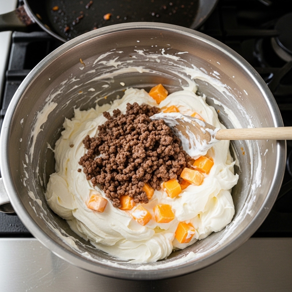- Fold in the cubed Velveeta, shredded Muenster cheese, and the cooked beef. Stir until everything is evenly mixed.
