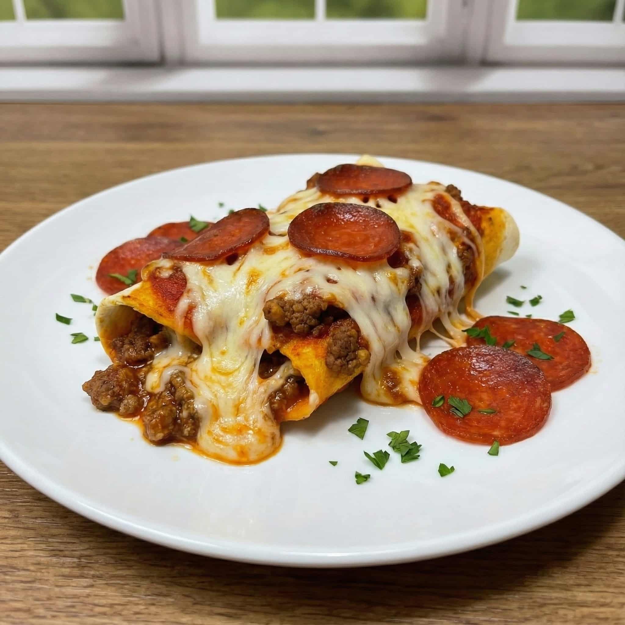 - Top & Bake: Pour the remaining pizza sauce evenly over the enchiladas, spreading to cover the edges. Top with the remaining mozzarella cheese and arrange pepperoni slices on top. Bake for 20-25 minutes until cheese is bubbly and lightly browned.