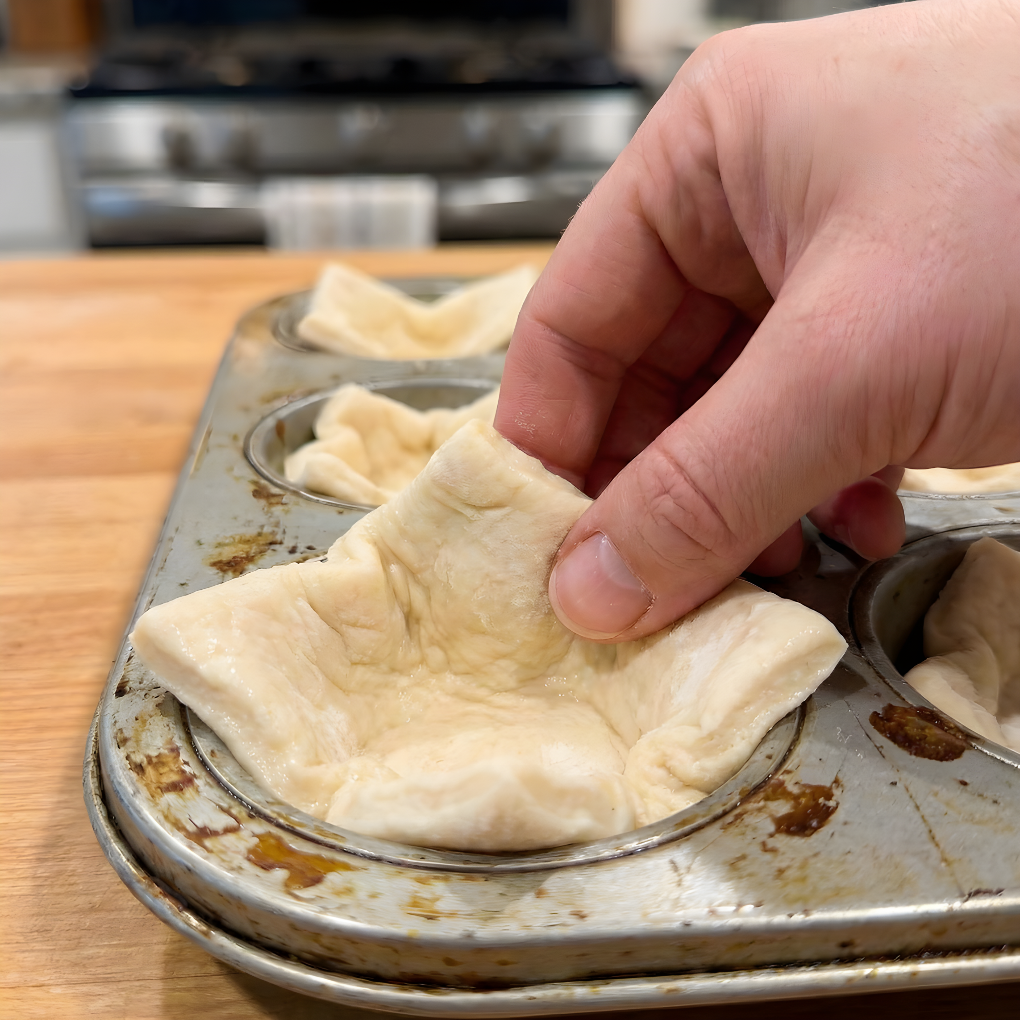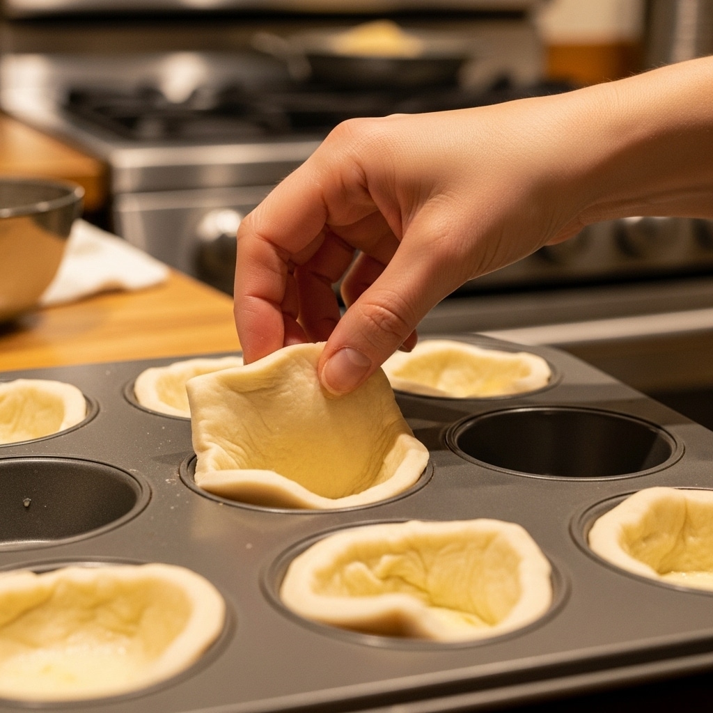 - Press each piece of dough firmly into the bottom and up the sides of the muffin cups to create a little bowl.