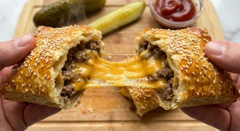 Cheeseburger Hot Pockets are flaky, golden puff pastry hand pies stuffed with juicy seasoned ground …