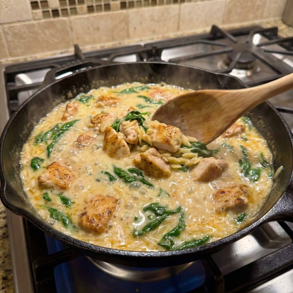 4. Cook Orzo: Stir in uncooked orzo and toast for 1 minute. Pour in chicken broth and bring to a simmer. Cook uncovered for 10–12 minutes, stirring occasionally to prevent sticking, until orzo is tender and most liquid is absorbed.
