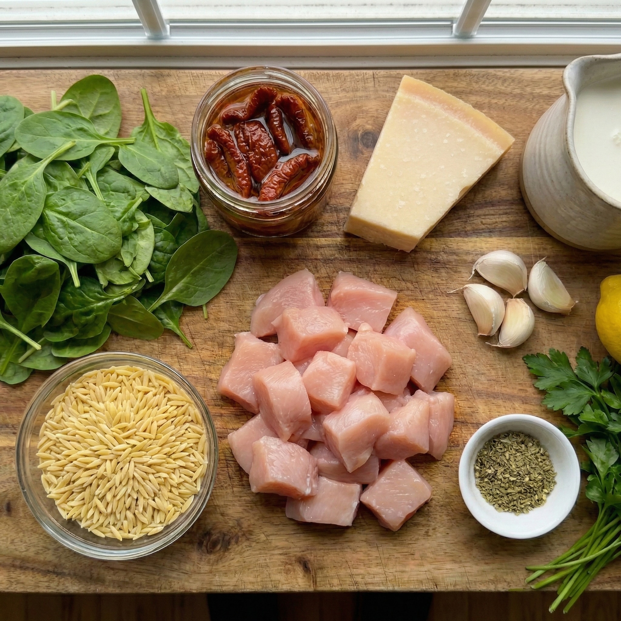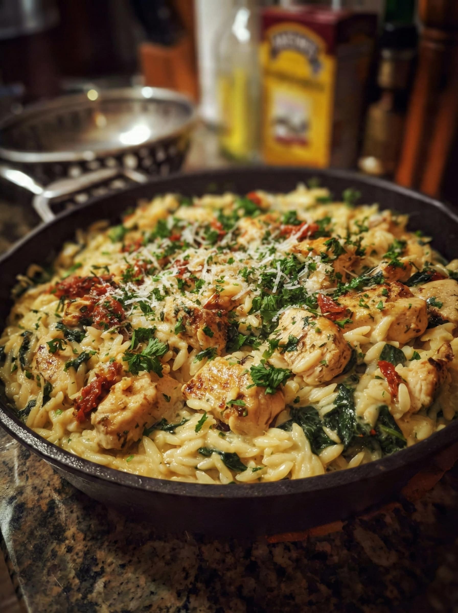 A comforting, one-pan meal loaded with juicy chicken, tender orzo pasta, spinach, and sun-dried tomatoes in a creamy Parmesan broth. High in protein, packed with flavor, and ready in 30 minutes for a satisfying, balanced dinner.