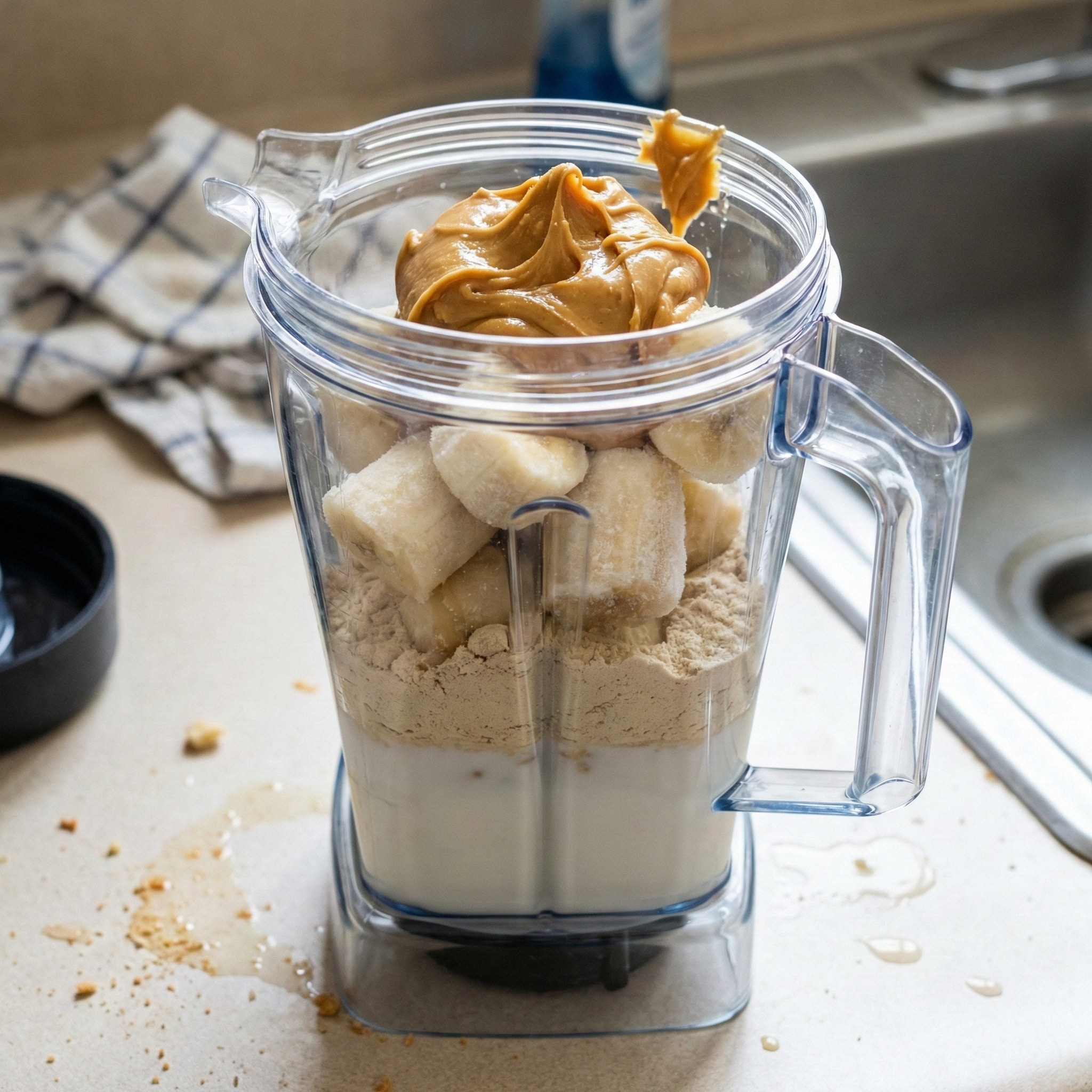 - Scoop in the peanut butter and any add-ins (chia/flax, vanilla, ice if needed).