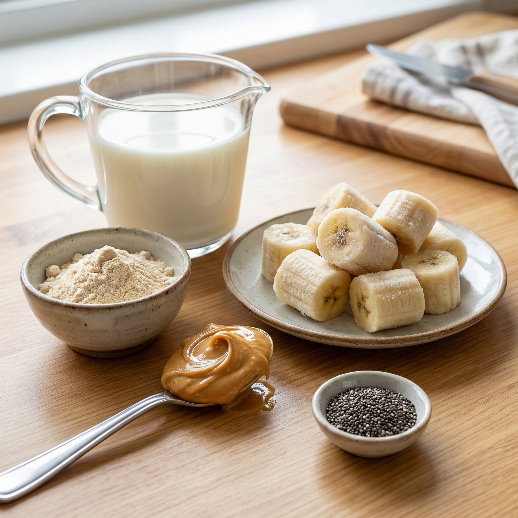 | 1 medium ripe banana, frozen | Frozen banana = thick smoothie. Fresh banana works, but add ice. |