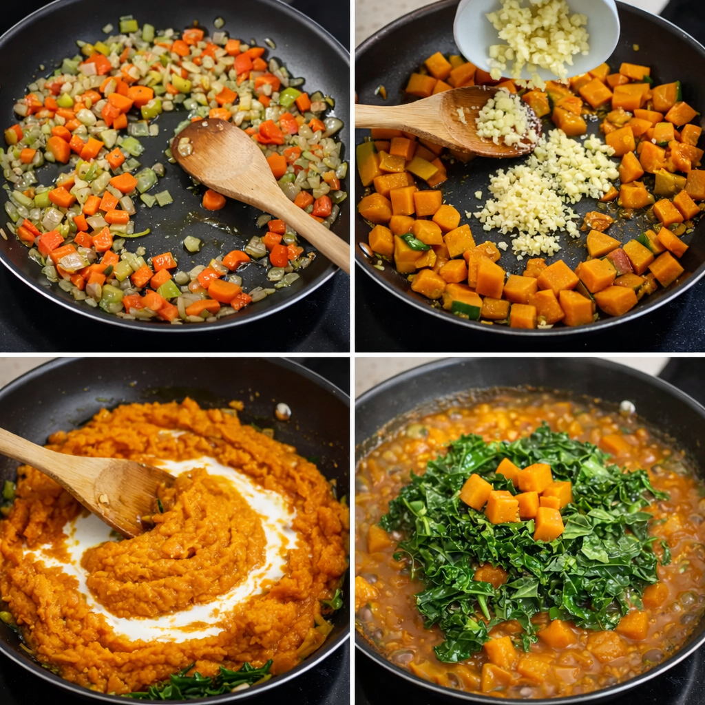 - Mix in the good stuff. Add all your spices (curry powder, turmeric, cumin, salt, smoked paprika, black pepper), passata, pumpkin puree, vegetable broth, and coconut milk. Stir everything together until it’s a beautiful, uniform orange color.