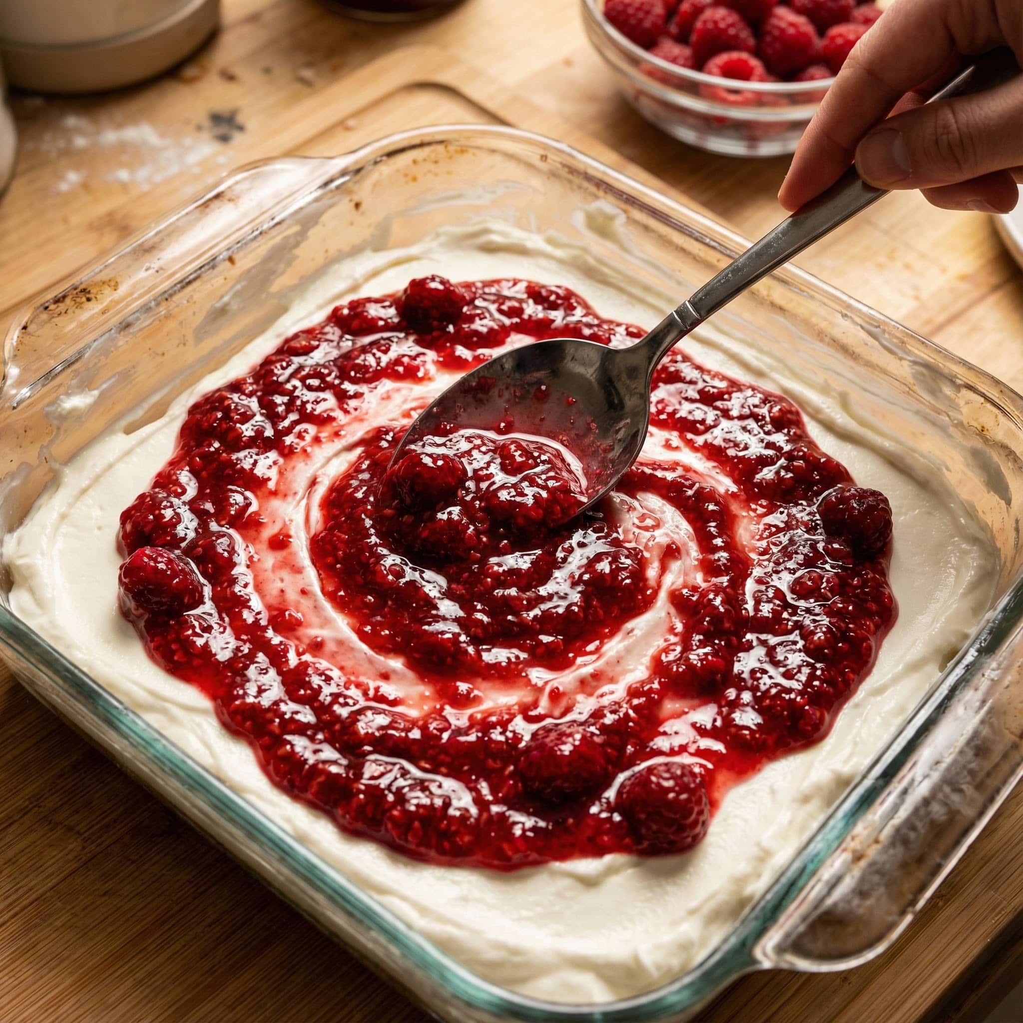 If you need a show-stopping dessert that doesn’t require turning on the oven, this is it. While the classic version spreads the cream on top like a lasagna, I prefer serving it “bakery style”—with the red raspberry layer shining through, dusted with crunch, and crowned with a perfect dollop of cream. It feels just a little bit fancier, don’t you think?