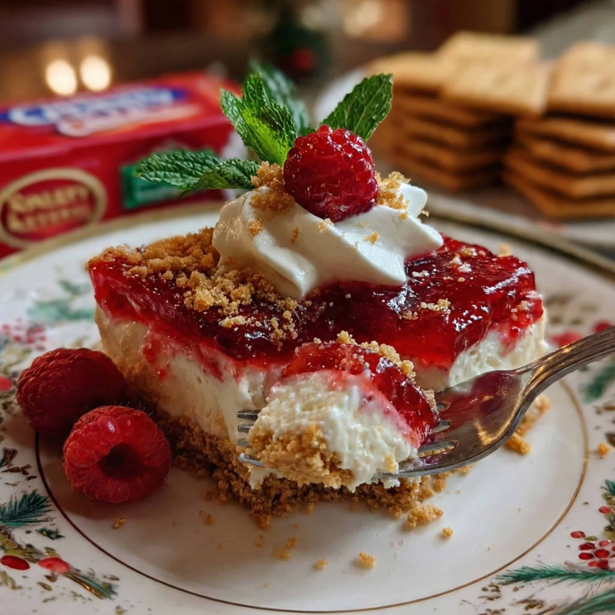 This Raspberry Delight is a refreshing, three-layer no-bake dessert featuring a buttery cinnamon-graham crust, a thick and creamy cheesecake filling, and a shimmering raspberry layer. Finished with a piped rosette of whipped cream and fresh berries, it’s a holiday-worthy treat that looks as good as it tastes.