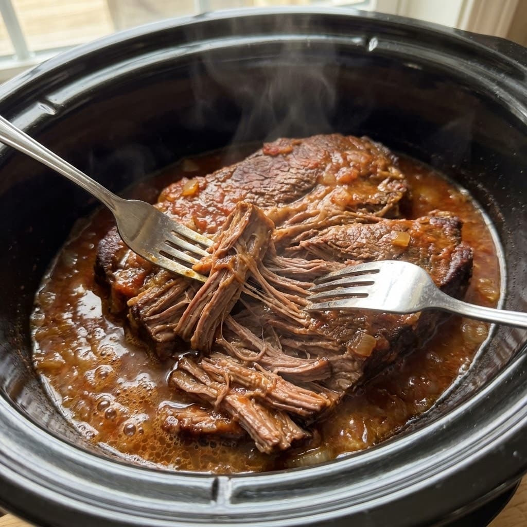 7. Remove the roast from the slow cooker, shred with two forks, and nestle it back into the juices for 5 minutes.