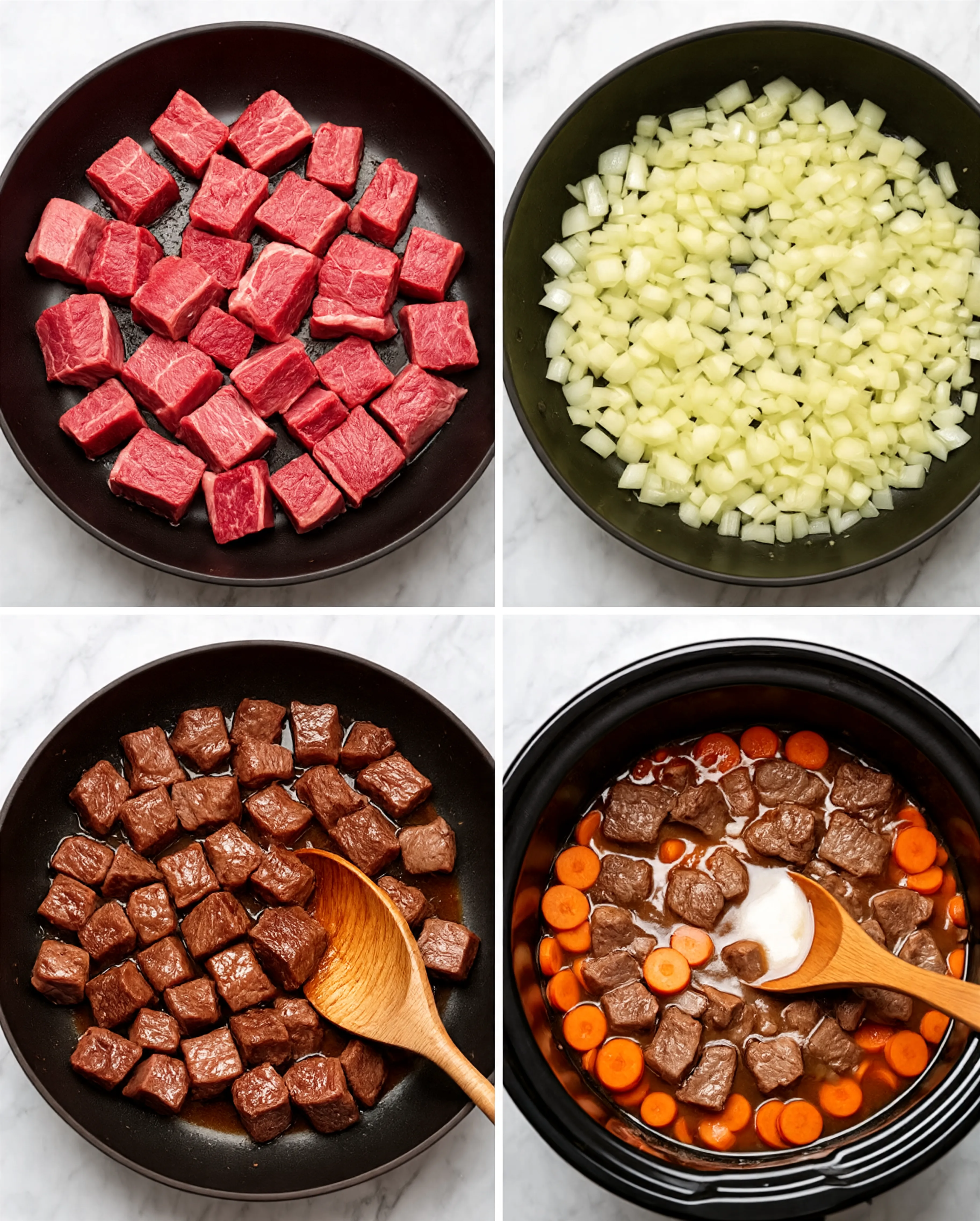 - Brown the beef: Heat 3 tablespoons of olive oil in a large skillet over medium-high heat. Add the meat in batches (don’t crowd the pan!) and sear on each side for about 45 seconds until it’s nice and brown. Transfer the browned beef to your slow cooker.
