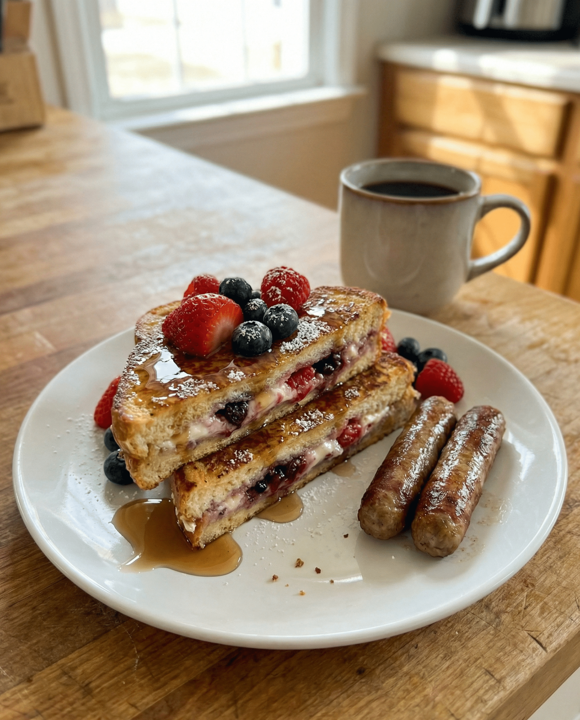 - Serve immediately for best results: Transfer your cooked stuffed French toast to plates (or a wire rack if making multiple batches), dust generously with powdered sugar, drizzle with warm maple syrup, and top with extra fresh berries. Honestly, this is when it’s at its absolute best—that contrast between the hot, crispy exterior and the cool, creamy filling is chef’s kiss.