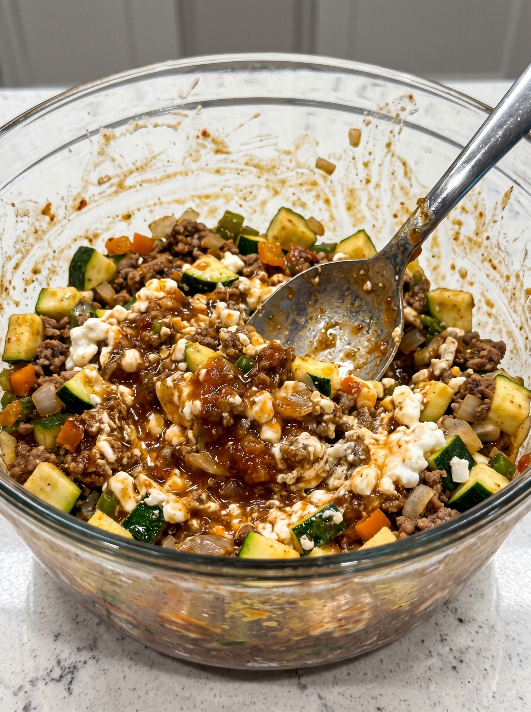 - Combine the patted-dry zucchini, the savory meat mixture, and the creamy cottage cheese in your large mixing bowl. Toss everything thoroughly until it’s perfectly mixed.