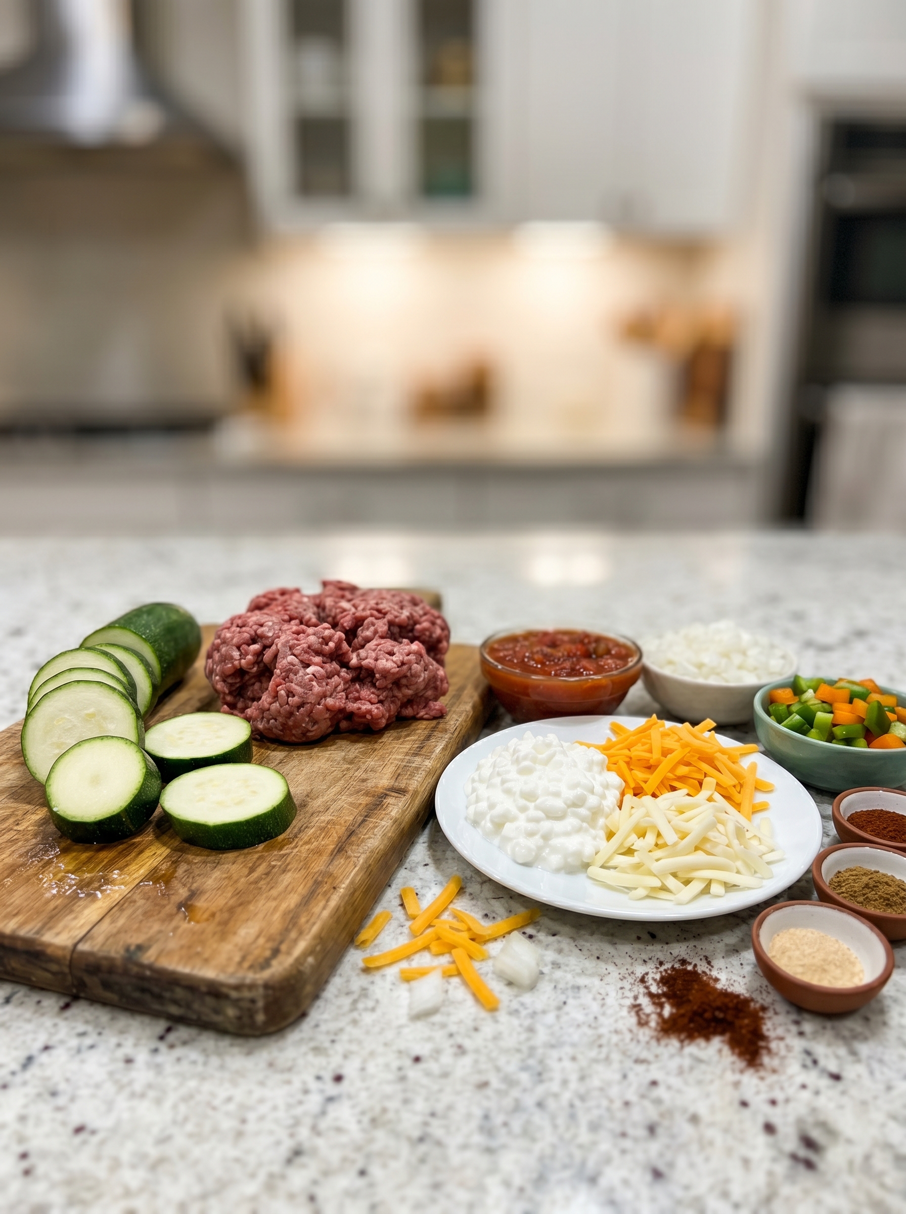 This incredibly cheesy Tex-Mex zucchini bake is a game-changing, high-protein casserole loaded with seasoned ground beef, tender zucchini, and a rich cottage cheese base, giving you all your favorite low-carb taco flavors in one comforting dish.