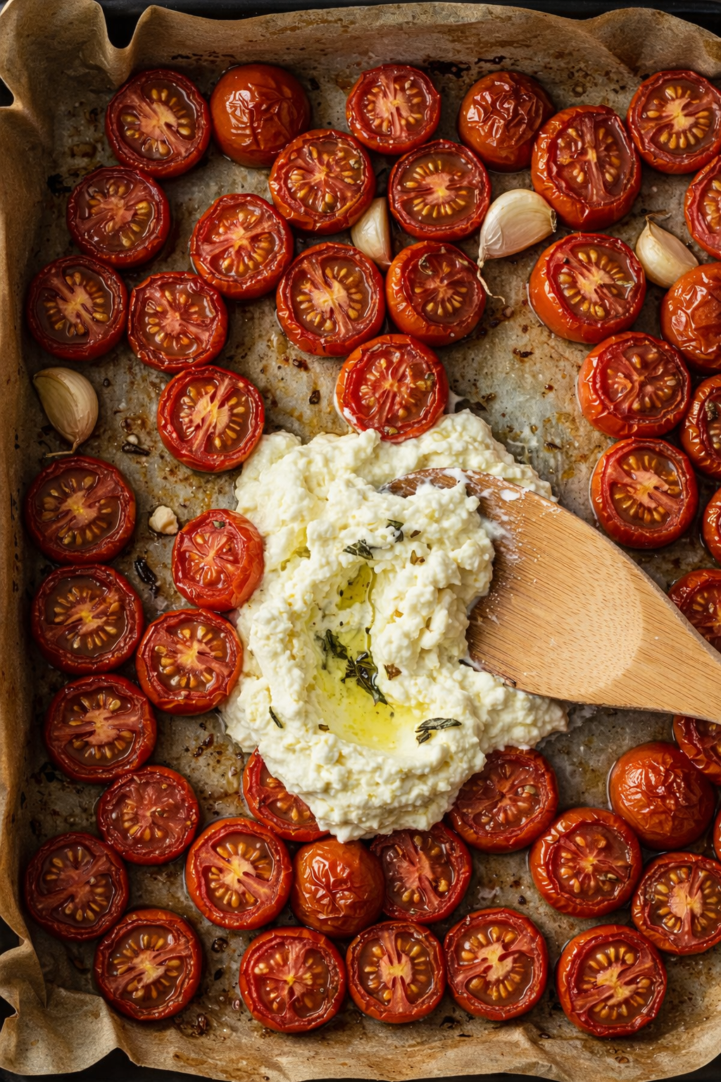 - Mash & Sauce: Using a wooden spoon or silicone spatula, lightly mash the feta block into the tomatoes on the baking sheet until a creamy, golden sauce forms. Transfer mixture to a large mixing bowl.
