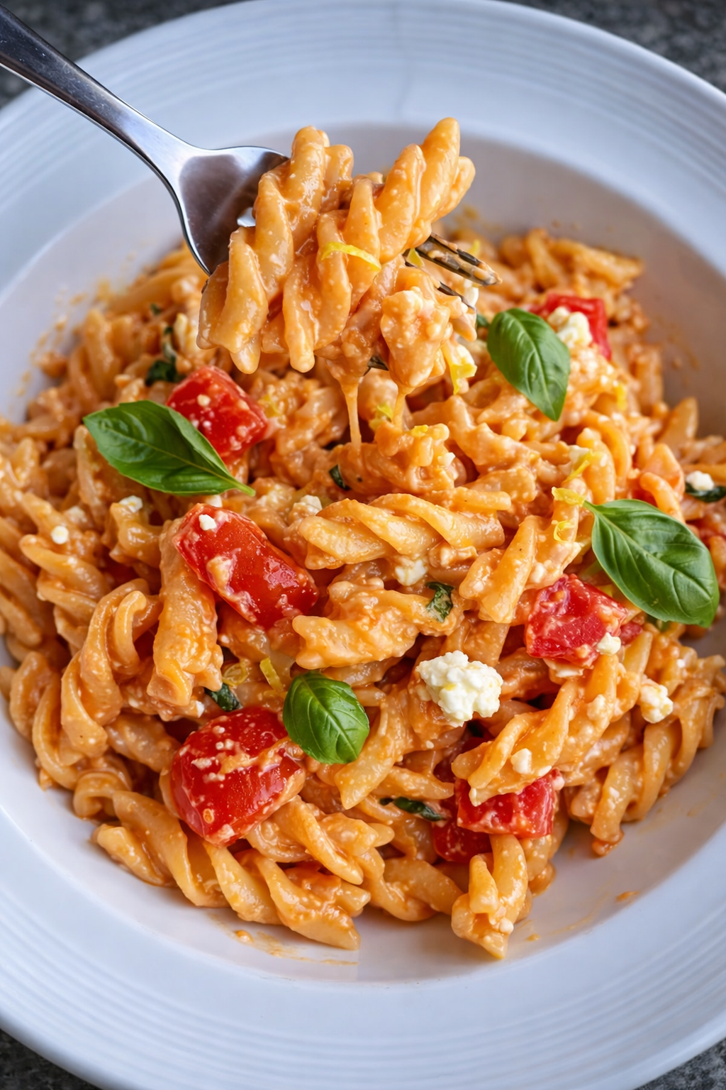 - Combine Pasta & Sauce: Add the hot pasta to the bowl with the tomato‐feta mixture. Pour in 2–3 tablespoons of reserved pasta water and toss vigorously until each noodle is coated in creamy sauce. Add more pasta water if needed for a looser consistency.